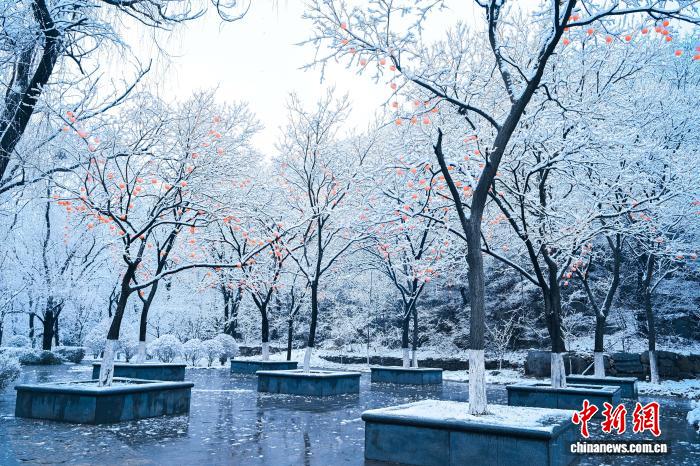 今日淄专潭溪山迎秋雪,玉树琼枝取葱翠潭火相应,好若火朱绘。(无人机像片)李沅昊 摄
